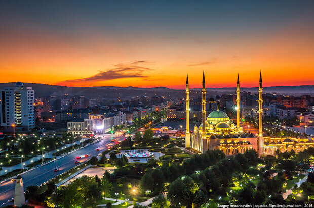 Солнце зашло, загораются первые огни в Грозном. Мечеть уже освещена.