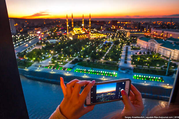 Говорят, «Сердце Чечни» — одна из самых больших мечетей мира. Честно говоря, сильно преувеличивают. Она и в России-то не самая большая, и в Европе. Куда там до Ближнего Востока и мира в целом...Но она красива. Действительно красива! Особенно в закатном свете и ночью, когда мечеть огромным светящимся островом возвышается над довольно темным ночным Грозным...